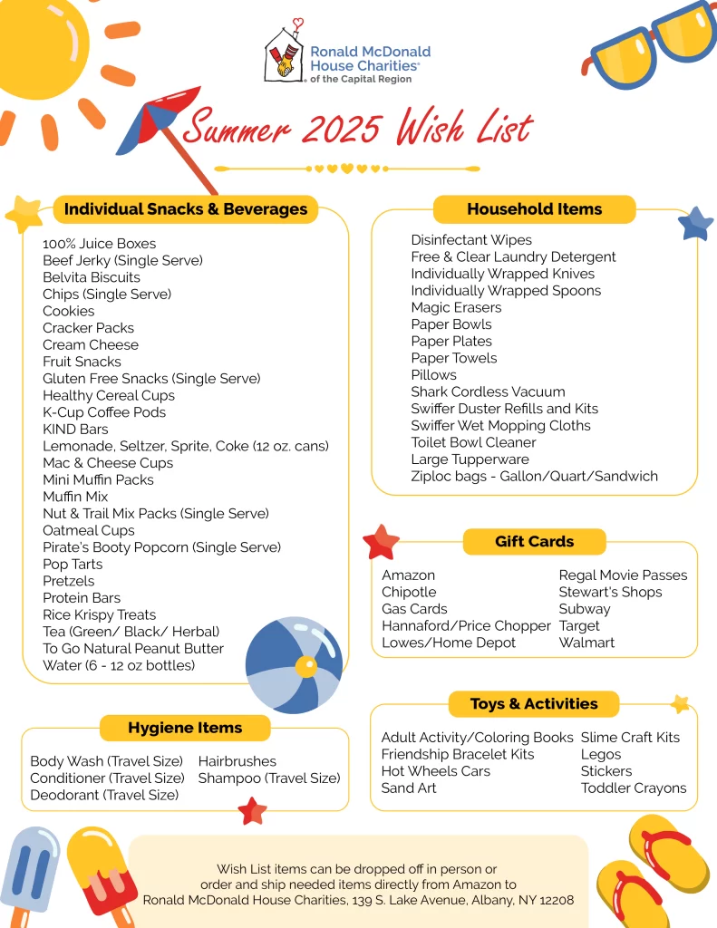 Consider hosting a wish list drive at your school, church or workplace to collect items that our families use daily. Encourage friends and family to bring wish list items to upcoming birthdays, celebrations, and meetings, or host a seasonal wish list drive to collect much-needed items. You can purchase items online and have them shipped directly to RMHC (139 S. Lake Avenue, Albany, NY 12208), drop items off in person at the Ronald McDonald House between 9:00 a.m. and 5:00 p.m., or contact us at (518) 438-2655 to make special arrangements for delivery.