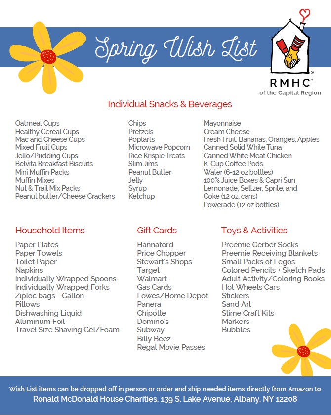 Our updated Spring Wish List is officially live, and your support makes all the difference for the families staying with us! From snacks and beverages to household and hygiene supplies, every item helps make our House feel more like a home. Donations may be dropped off or mailed directly the the House at the address above. Any brand and any quantity is appreciated!